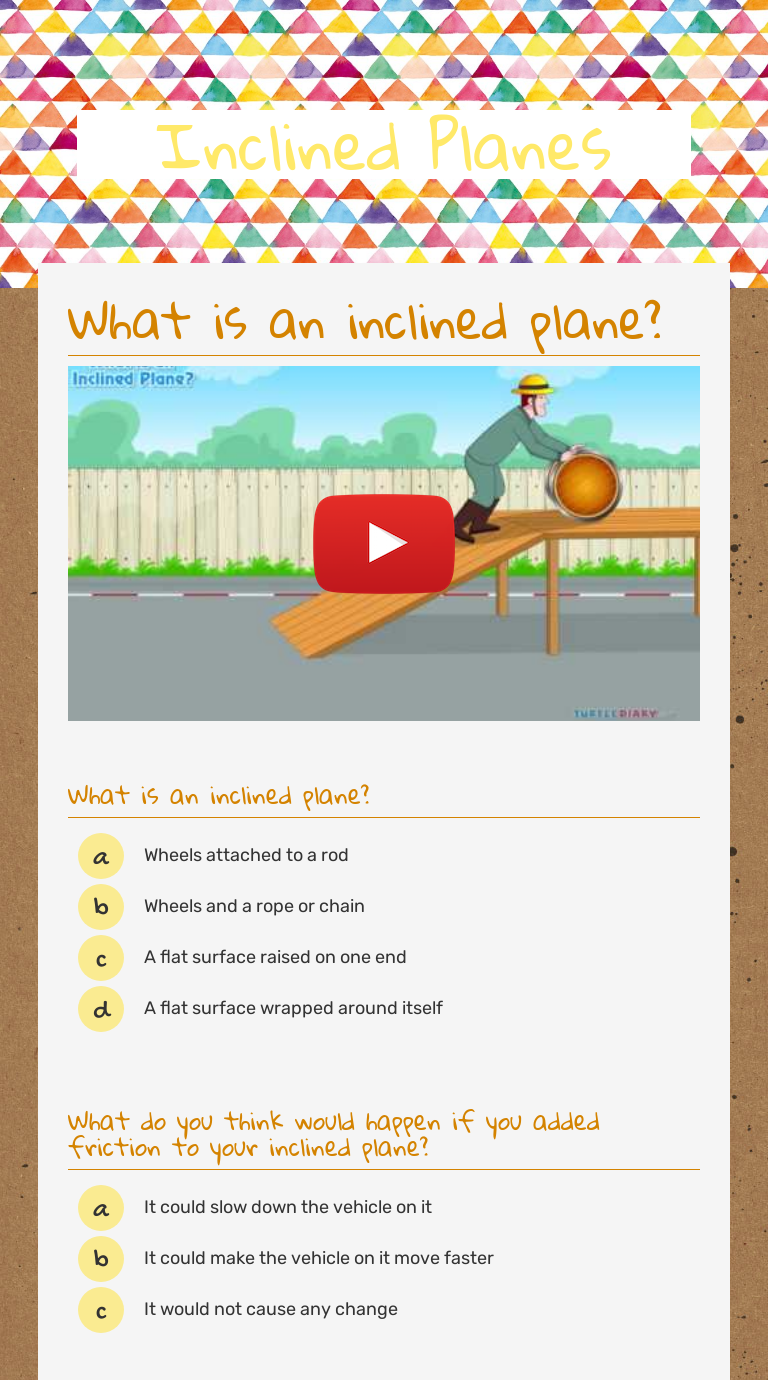 Machines (lever, screw, pulley, wheel and axle, inclined plane, and wedge);. Divide the class up into groups depending on the number of supplies. Elementary students explore the inclined plane through activities in this lesson plan. A simple machine worksheet for earning about the inclined planes. Inclined plane and data sheet to the groups and the materials .